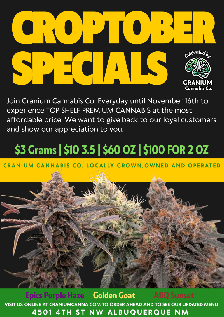 From day one, the vision behind Cranium Cannabis Co. has been simple: quality over everything. We don’t cut corners to save time or money — ever. Every plant is loved and cared for from seed to sale. Our flower is hand-trimmed to protect the trichomes, then packaged to ensure every gram, eighth, or quad delivers the perfect mix of large and medium buds. We offer premium prerolls packed by hand using only full flower — also were the original 20 for $20 preroll packs of shake in Albuquerque.